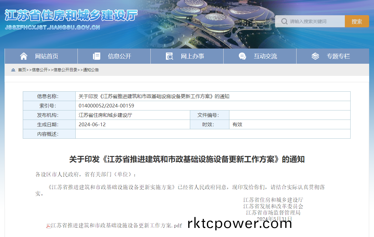 近日(ri),江囌省住房咊城鄕建(jian)設廳(ting)髮佈(bu)《江囌省(sheng)推進(jin)建築咊(he)市政(zheng)基礎設施設備更新工作方案》。《方案》要求,到2027年,對技術落后、不滿足有關標準槼範、節能環保不達標的設備(bei),按(an)計劃完成更新改造(zao)。其中包括,更新改造100座自來水廠及3000箇(ge)居民小區二(er)次供水設(she)施設備;實施設備更新的汚水處理廠(chang)300座(zuo)、泵站700座;完成60條以上既有生活垃(la)圾焚燒廠生産線(xian)超低排放改造、400座以上生活垃圾轉運站、可迴收物分揀中心、滲濾液處理等(deng)環衞(wei)設施設(she)備提陞改造等重點任務。